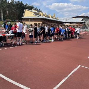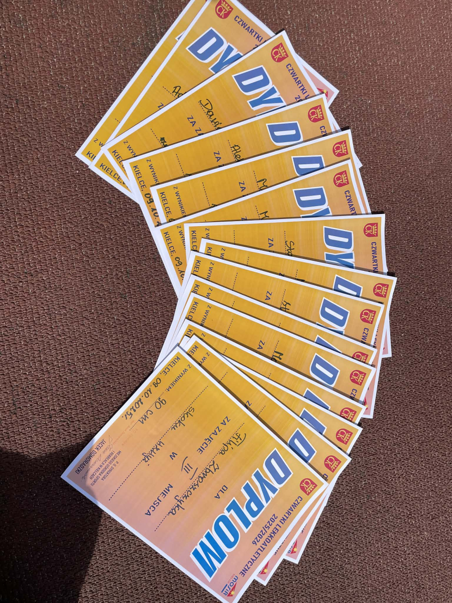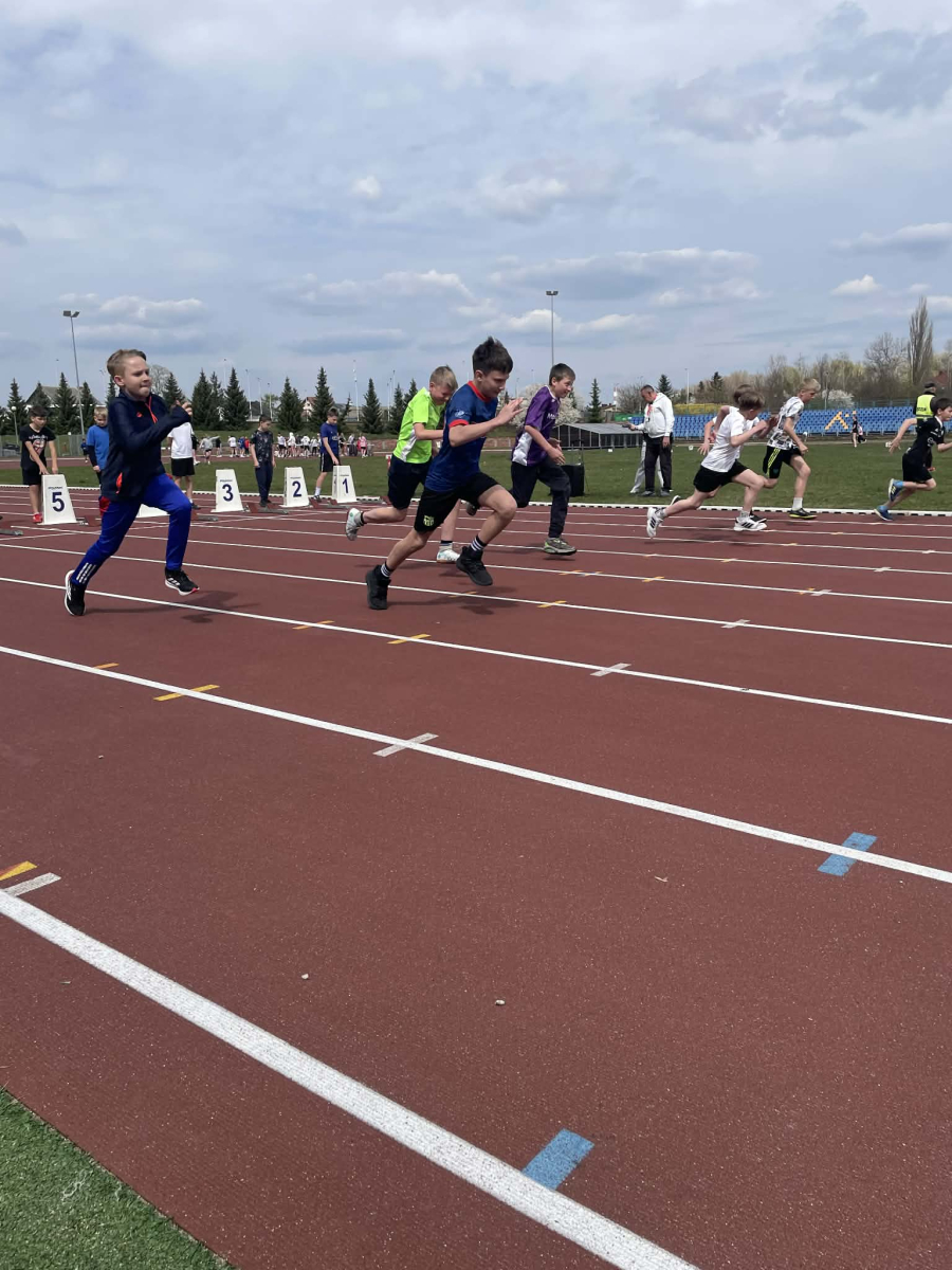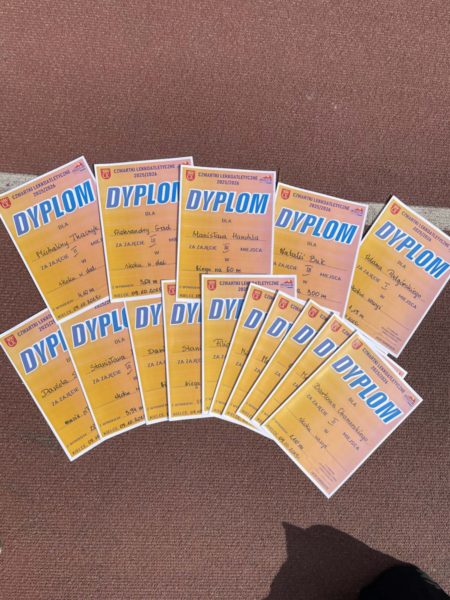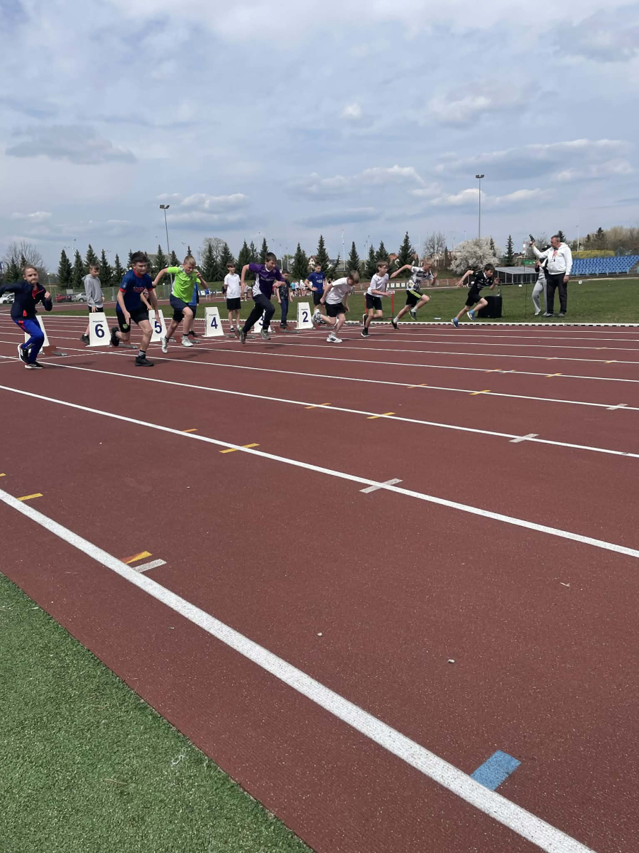 16 kwietnia 2026r. rozpoczęły się wiosenne starty cyklicznych zawodów lekkoatletycznych „Czwartki Lekkoatletyczne”. W pierwszym tegorocznym spotkaniu wzięło udział 14 uczniów naszej szkoły, którzy rywalizowali z zawodnikami ze szkół podstawowych z całego województwa. Nasi reprezentanci startowali w takich konkurencjach jak: bieg na 60 m, bieg na 300 m, skok w dal, skok wzwyż oraz rzut piłeczką palantową. Na oficjalne wyniki z tego startu musimy jeszcze chwilę poczekać – zostaną one ogłoszone podczas kolejnych zawodów. Z dumą wracamy jednak do osiągnięć z poprzedniej edycji. 9 października 2025r. nasi uczniowie wywalczyli aż 15 miejsc medalowych!
