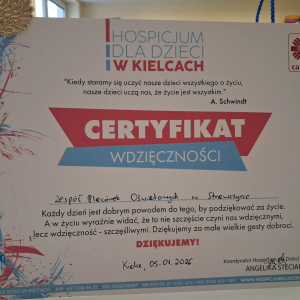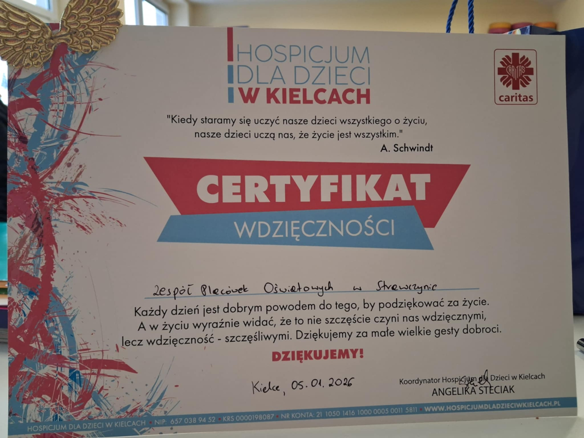 Z dumą informujemy, że społeczność naszej szkoły po raz kolejny udowodniła, jak wielką siłę ma wspólne pomaganie i wrażliwość na potrzeby drugiego człowieka. Dzięki ogromnemu zaangażowaniu uczniów, rodziców oraz nauczycieli Szkolne Koło Wolontariatu zorganizowało zbiórkę pieniędzy, które zostały oficjalnie przekazane na wsparcie podopiecznych Hospicjum dla Dzieci w Kielcach. Akcja spotkała się z bardzo pozytywnym odzewem i pokazała, że los chorych dzieci oraz ich rodzin nie jest nam obojętny.