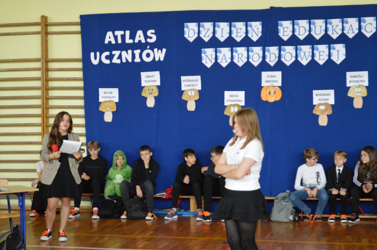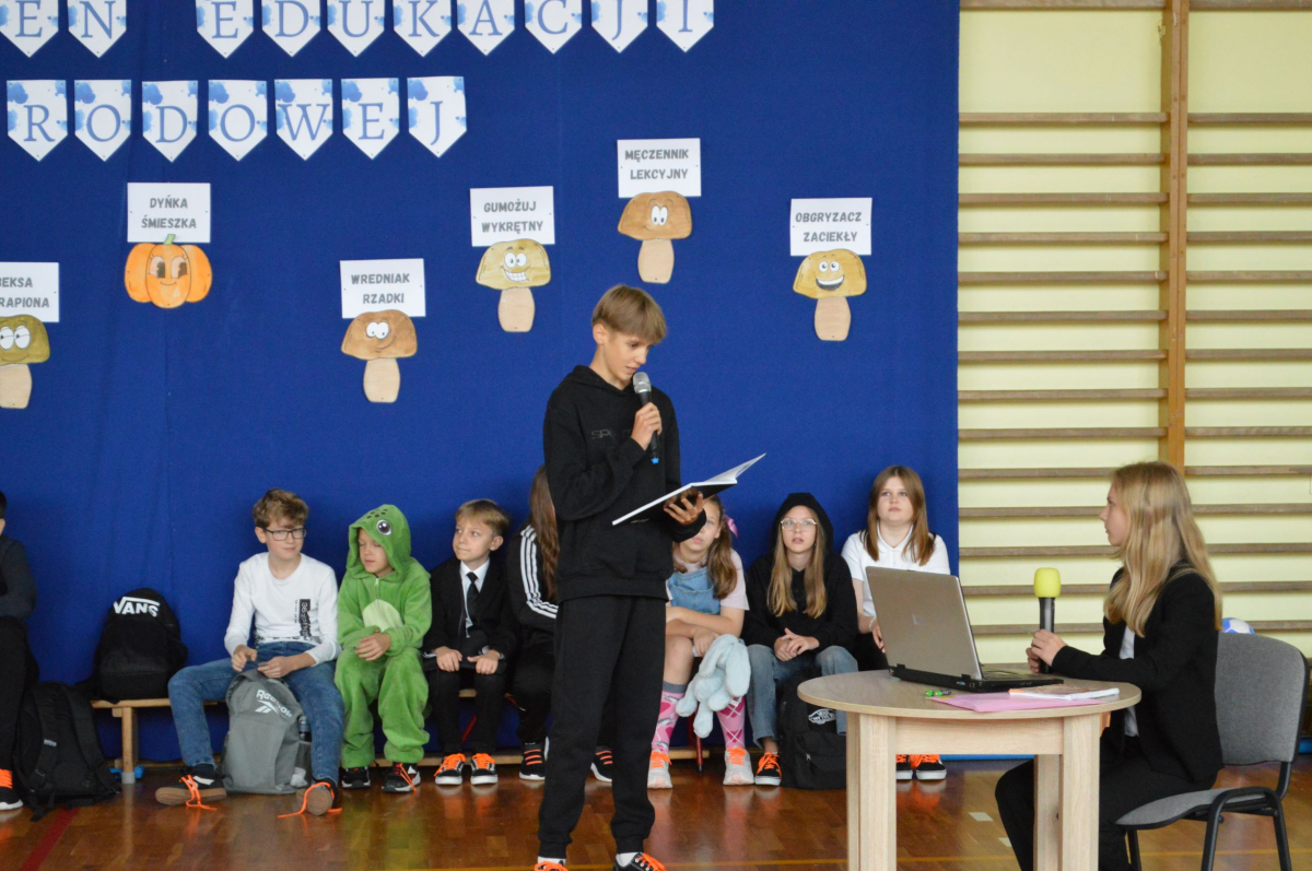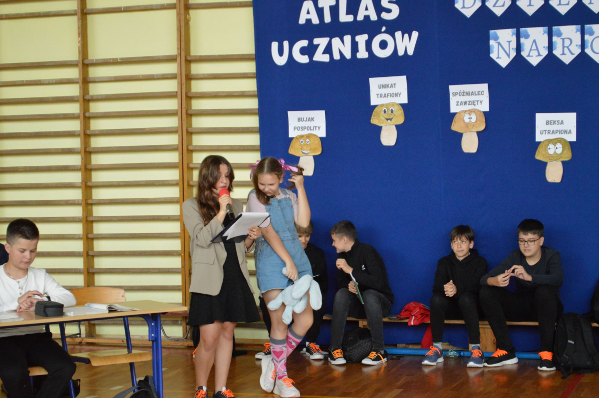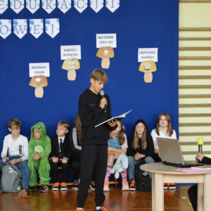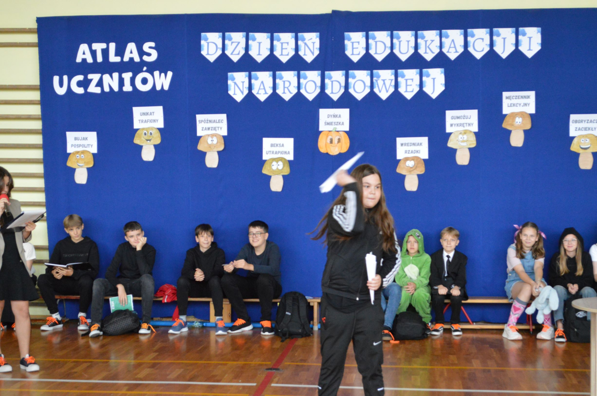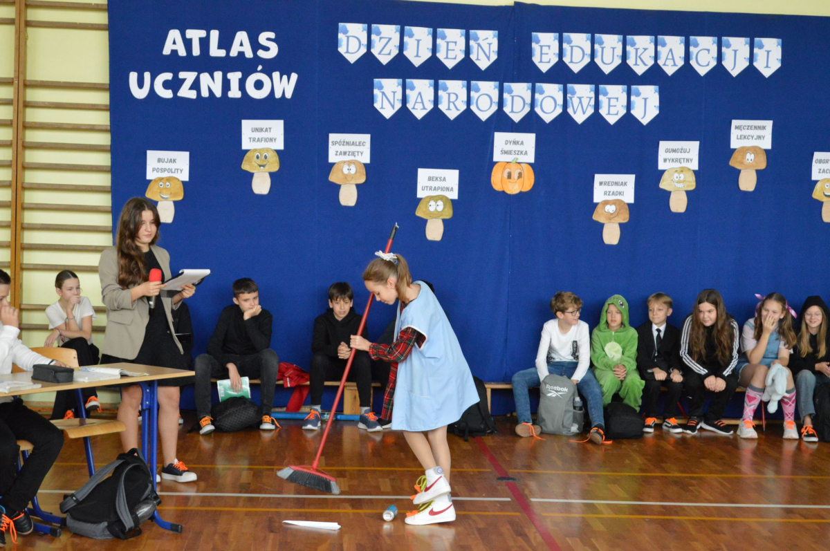 13 października 2025r. w naszej szkole odbyło się niecodzienne przedstawienie z okazji Dnia Edukacji Narodowej. Uczniowie klasy 7a zaprosili widownię do…”lasu” pełnego…uczniów! W zabawny sposób przedstawione zostały najpopularniejsze typy uczniów, jak na przykład Obgryzacz Zaciekły, Maruda Lekcyjna, Bujak Pospolity, Pracuś Szlachetny, Spóźnialec Zawzięty czy też Wszystkoposiadacz Niepospolity. Przedstawienie zostało dopełnione przez taniec w wykonaniu chłopców a także skecz „Z życia pokoju nauczycielskiego” oraz występ szkolnego chóru. Popłynęło kilka łez, na szczęście ze śmiechu!