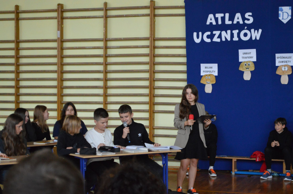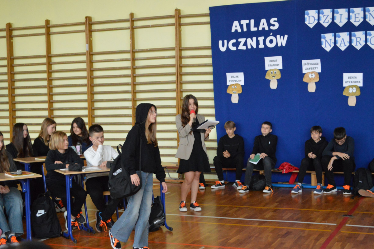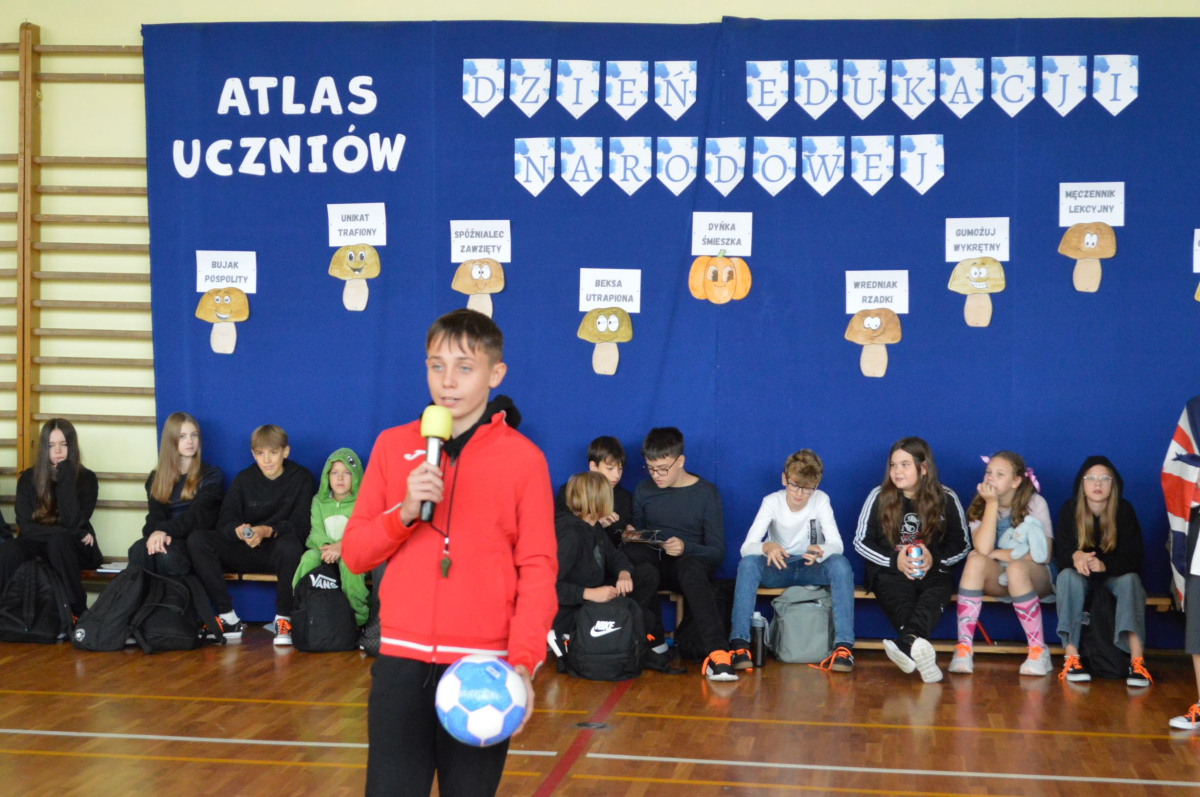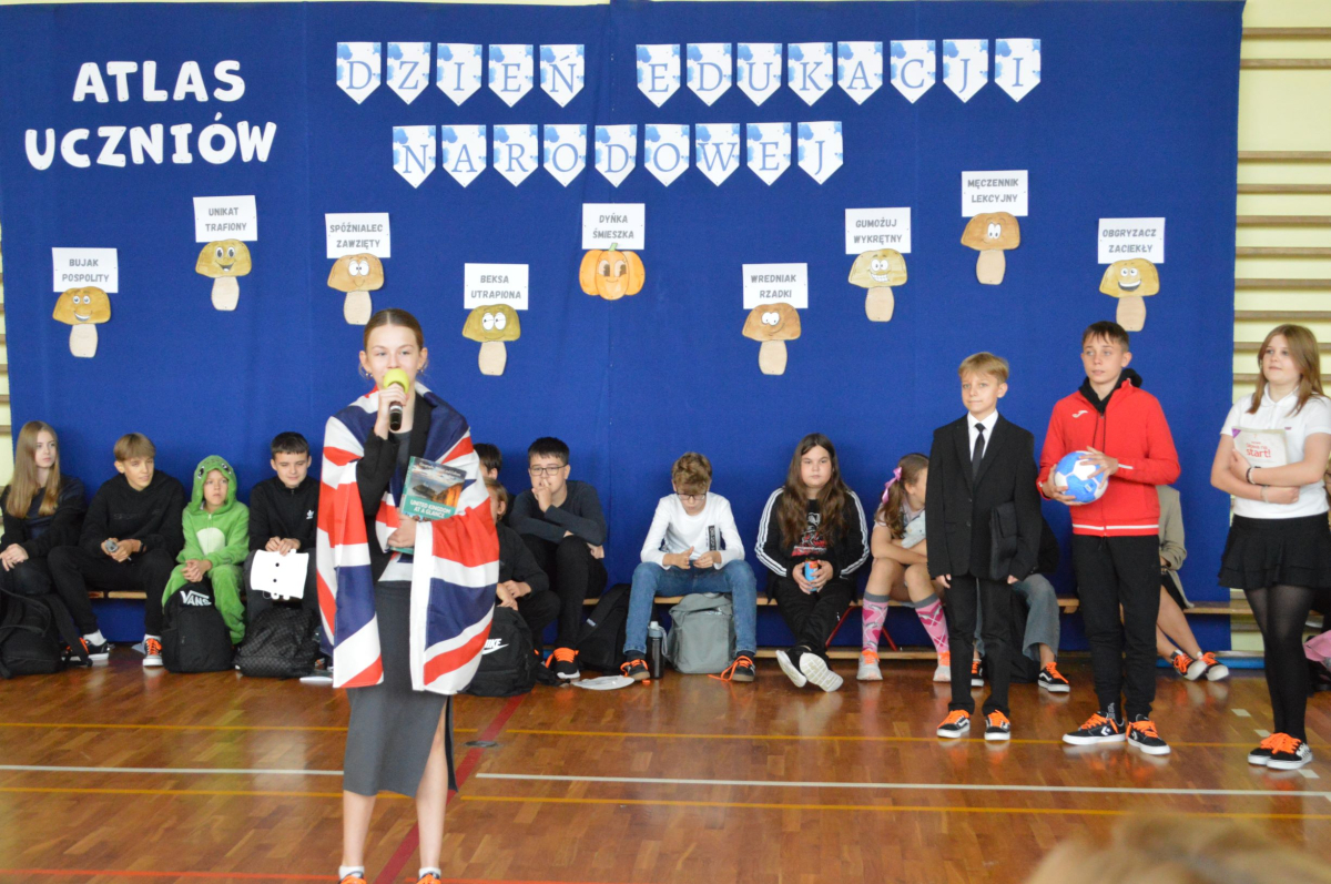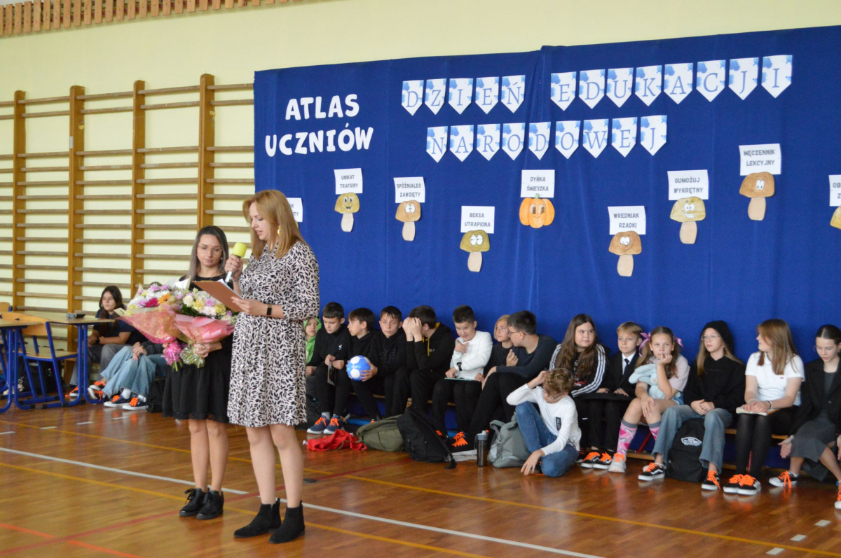 13 października 2025r. w naszej szkole odbyło się niecodzienne przedstawienie z okazji Dnia Edukacji Narodowej. Uczniowie klasy 7a zaprosili widownię do…”lasu” pełnego…uczniów! W zabawny sposób przedstawione zostały najpopularniejsze typy uczniów, jak na przykład Obgryzacz Zaciekły, Maruda Lekcyjna, Bujak Pospolity, Pracuś Szlachetny, Spóźnialec Zawzięty czy też Wszystkoposiadacz Niepospolity. Przedstawienie zostało dopełnione przez taniec w wykonaniu chłopców a także skecz „Z życia pokoju nauczycielskiego” oraz występ szkolnego chóru. Popłynęło kilka łez, na szczęście ze śmiechu!