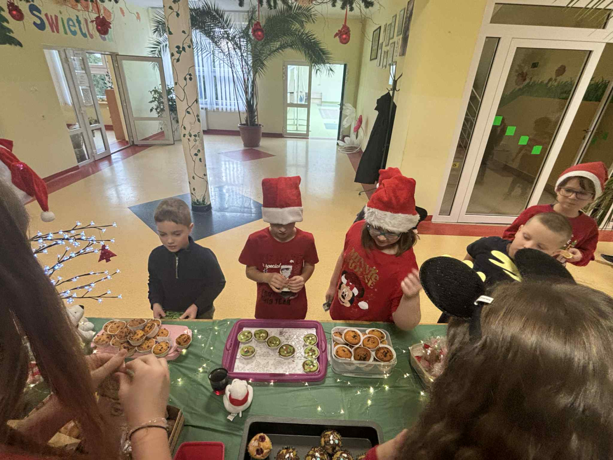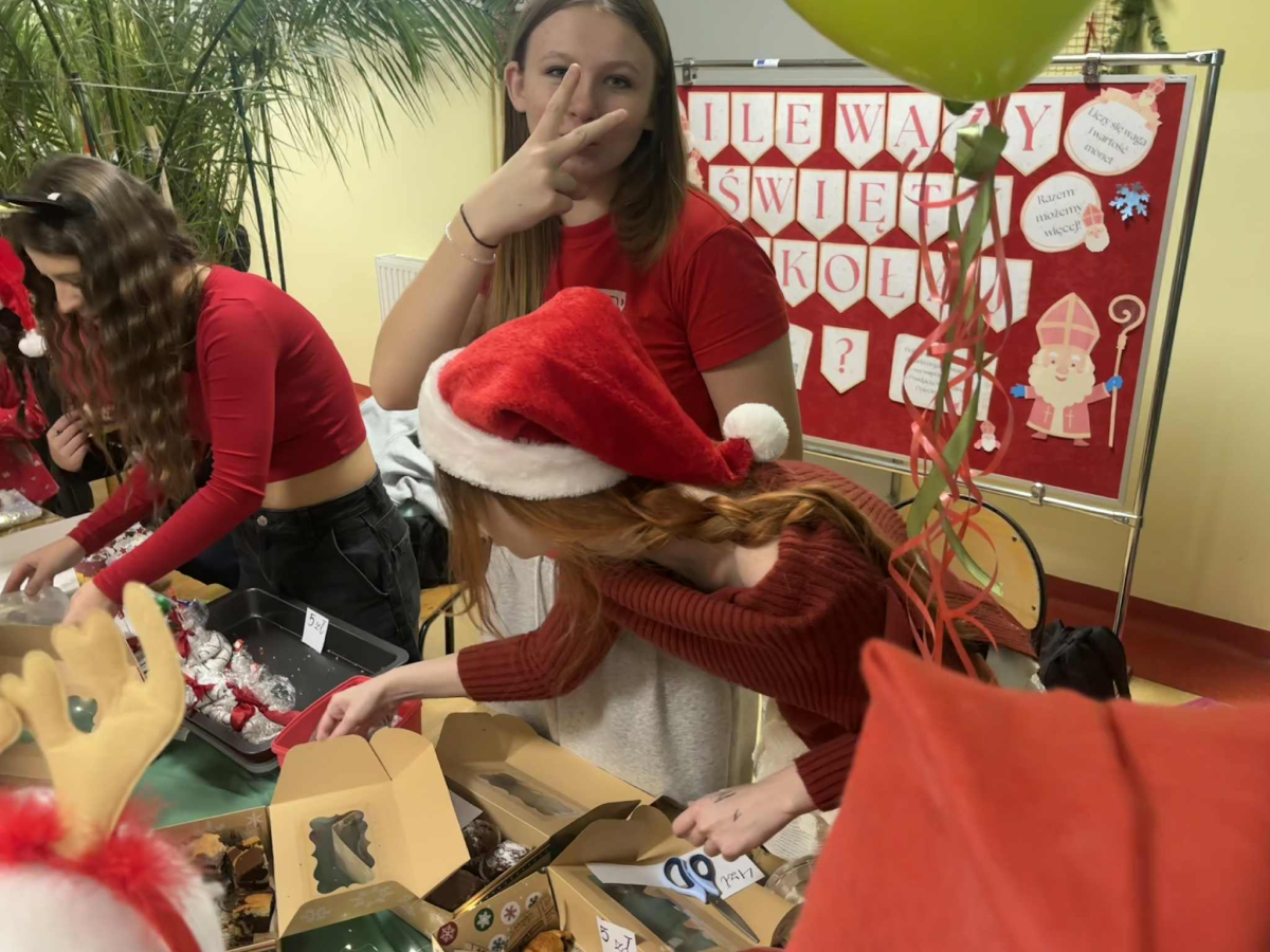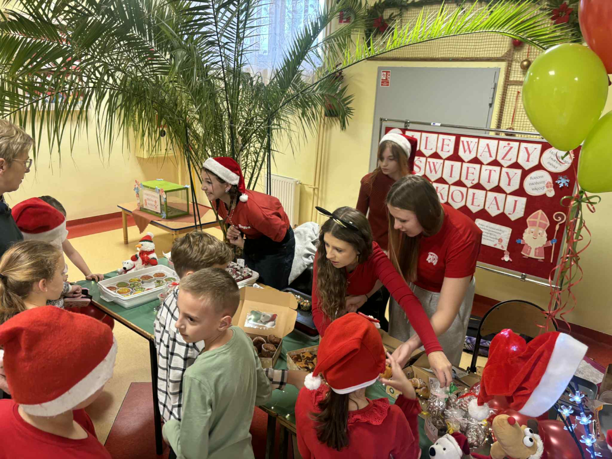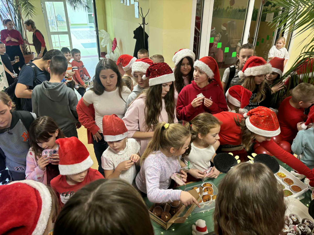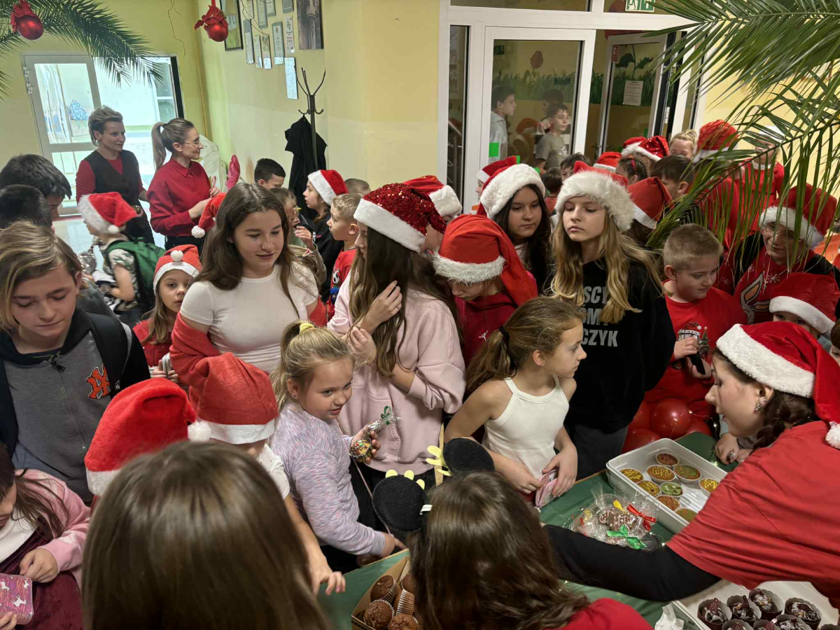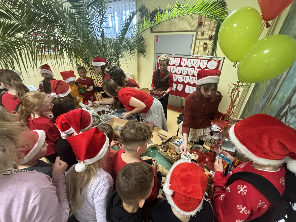 W naszej szkole trwa charytatywna zbiórka monet w ramach ogólnopolskiej akcji „Ile waży Święty Mikołaj?”. Aby wesprzeć inicjatywę, uczniowie przygotowali wyjątkowy mikołajkowy kiermasz ciasteczek, z którego cały dochód zostanie przeznaczony na cel akcji. Poniżej prezentujemy krótką fotorelację z kiermaszu, pełną świątecznej atmosfery, uśmiechów i zaangażowania naszych uczniów. Serdecznie dziękujemy wszystkim, którzy wzięli udział w wydarzeniu – za upieczone smakołyki, pomoc w organizacji oraz każdą wrzuconą do puszki monetę. Razem możemy naprawdę wiele!