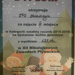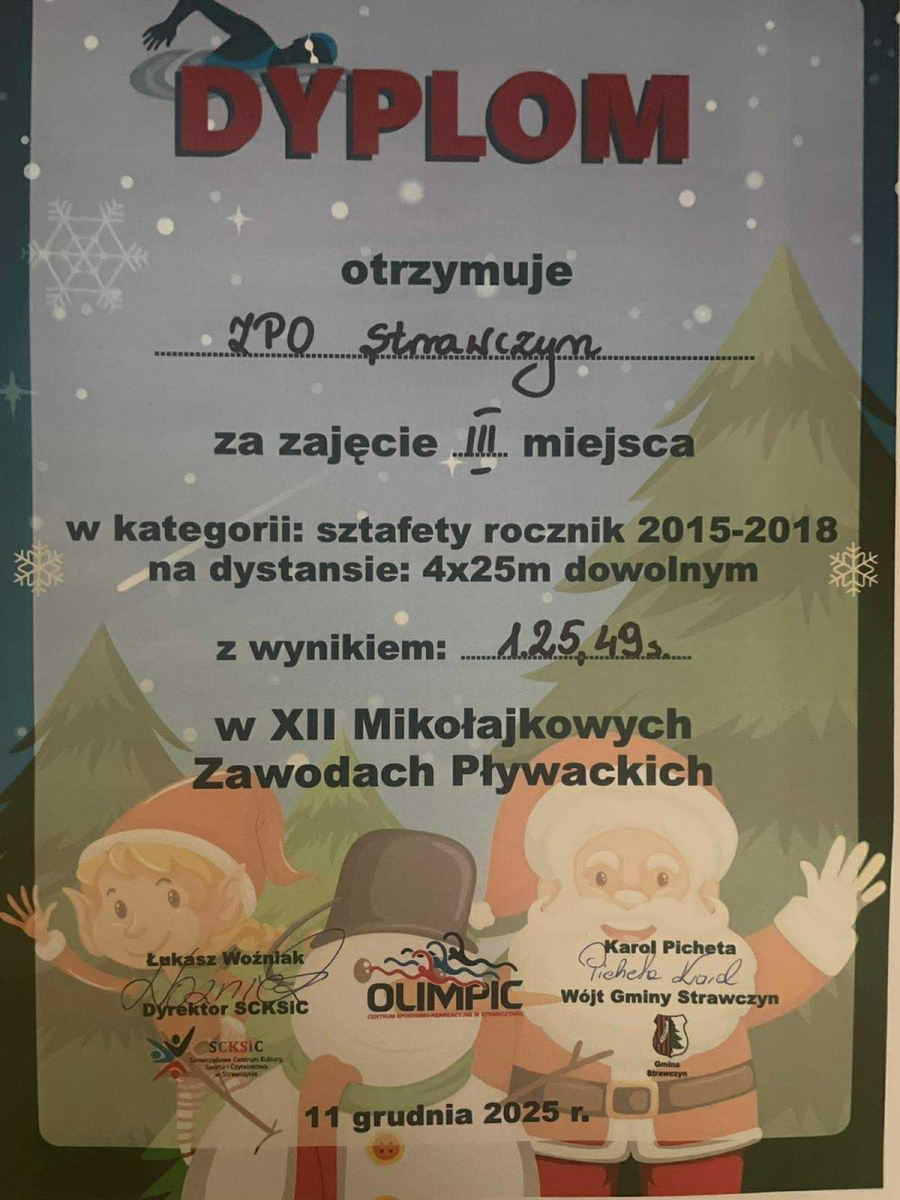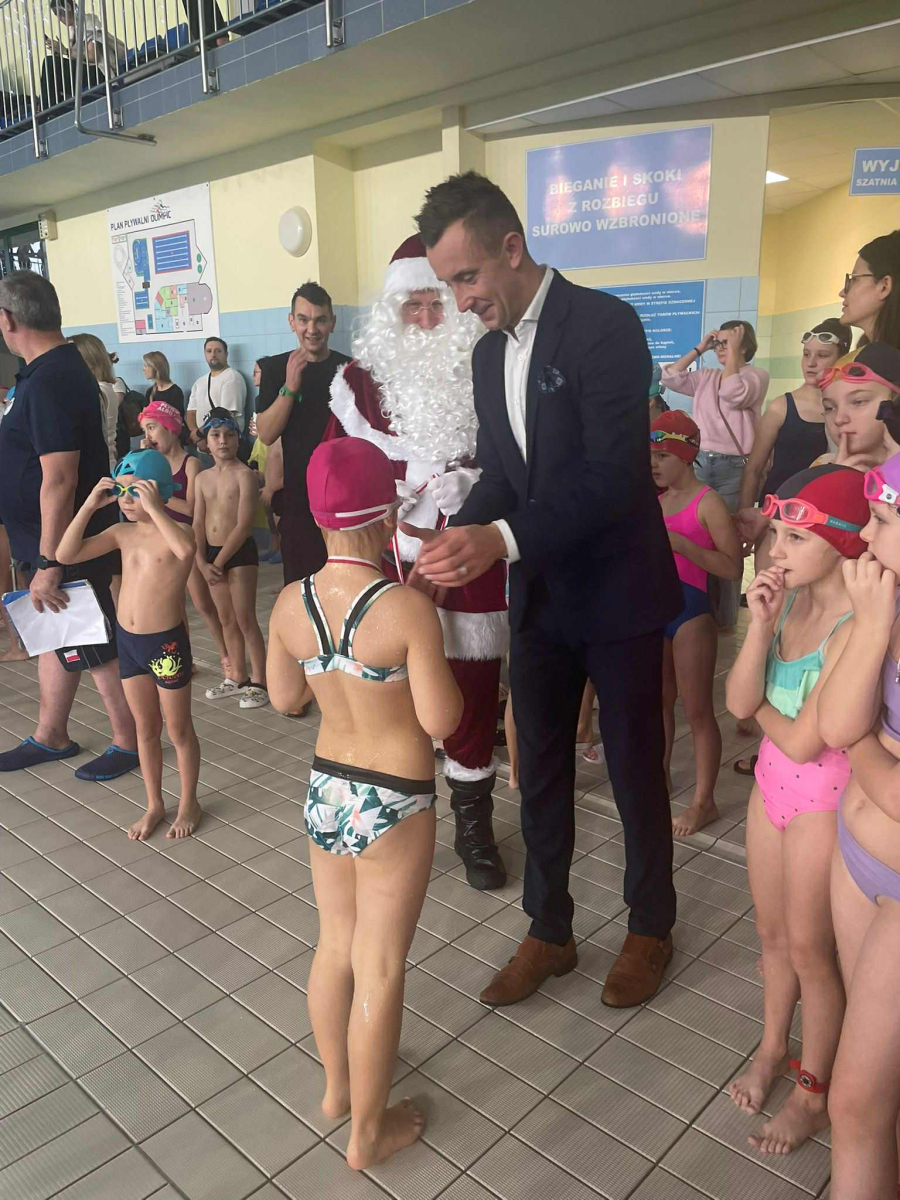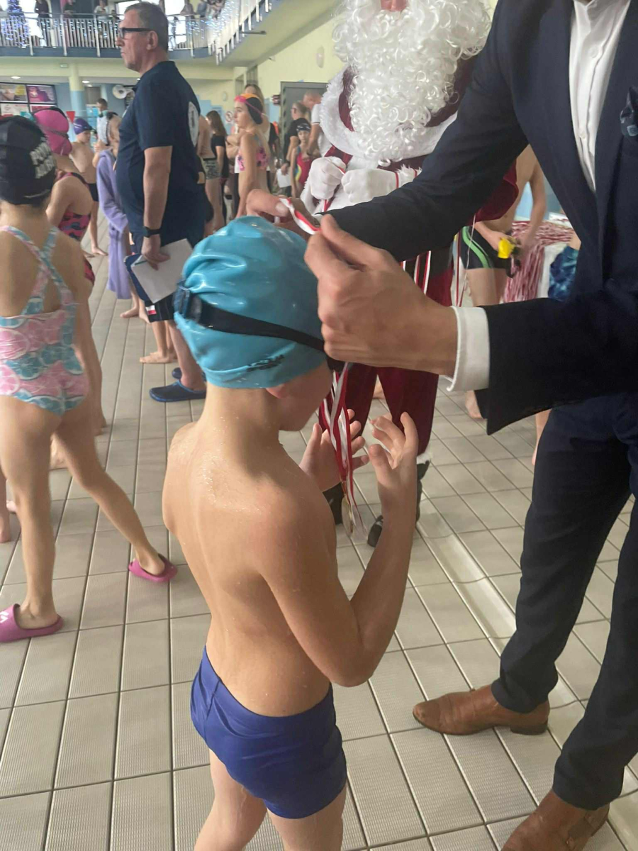 11 grudnia na basenie Olimpik odbyły się Mikołajkowe Zawody w Pływaniu. Z naszej szkoły wystartowało 35 uczniów z klas I - VIII. Wszyscy z dużym zaangażowaniem walczyli o jak najlepsze miejsce, poprawiając swoje życiówki. Najlepsze wyniki w swoich kategoriach wiekowych uzyskali: Klara Nawrot -I miejsce na dystansie 25 m w kategorii klas III- IV. Pola Jaś - II miejsce na 25 m. w kat. klas I - II, Laura Rusińska – III miejsce na 25 m w kat. klas I- II, Sztafeta 4x 25m w kategorii klas młodszych zdobyła III miejsce w składzie: Klara Nawrot, Filip Dziuba, Filip Zbroszczyk i Dawid Pańczyk. Wszystkim wielkie gratulacje.