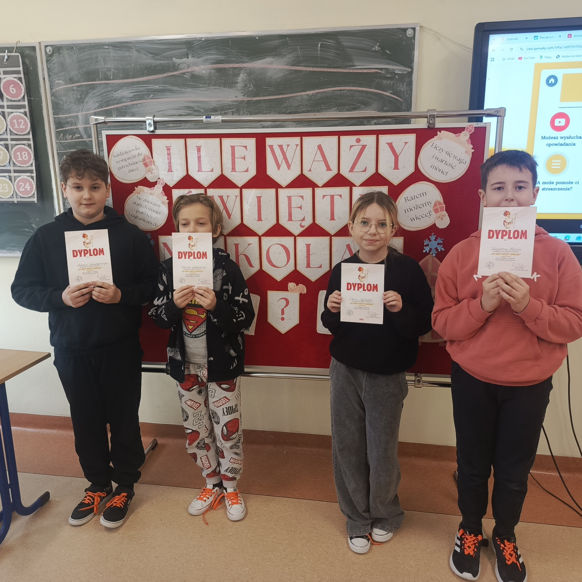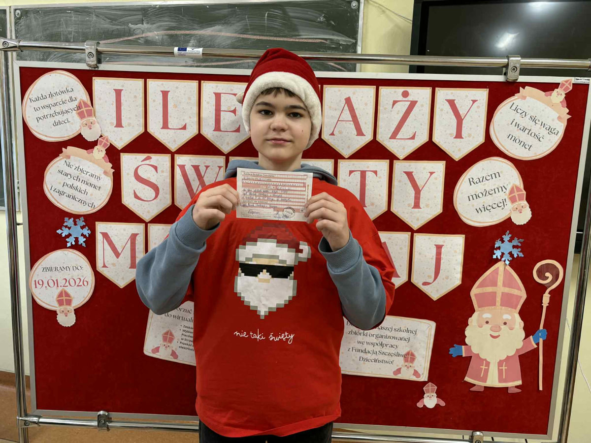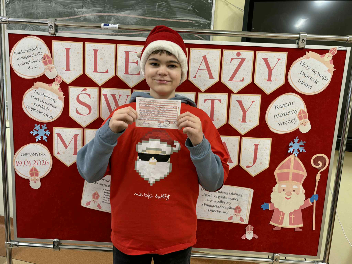Z radością informujemy, że zakończyła się nasza świąteczna akcja „Ile waży Święty Mikołaj?” W ferie wraz z samorządem uczniowskim policzyliśmy, spakowaliśmy i wysłaliśmy wszystkie zebrane monety. Dzięki Waszej hojności przekazaliśmy na rzecz Fundacji Szczęśliwe Dzieciństwo aż 2041,61 zł! A nasz szkolny Święty Mikołaj… okazał się ważyć dokładnie 10 kg!