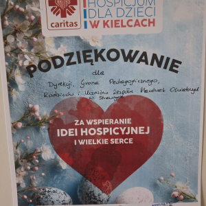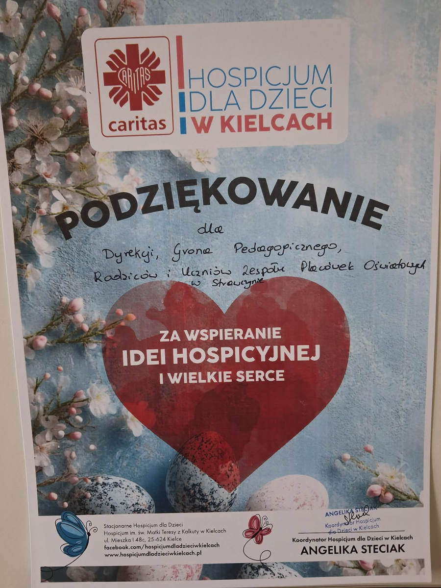Szkolne Koło Wolontariatu przy Szkole Podstawowej im. Stefana Żeromskiego w Strawczynie z ogromną radością i wdzięcznością informuje, iż środki finansowe zebrane podczas tegorocznego kiermaszu świątecznego zostały przekazane na rzecz Stacjonarnego Hospicjum Dziecięcego w Kielcach.