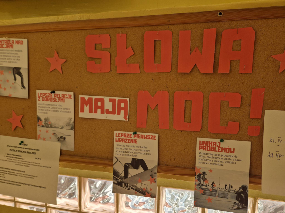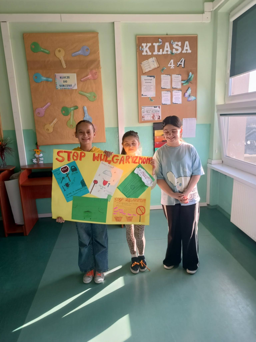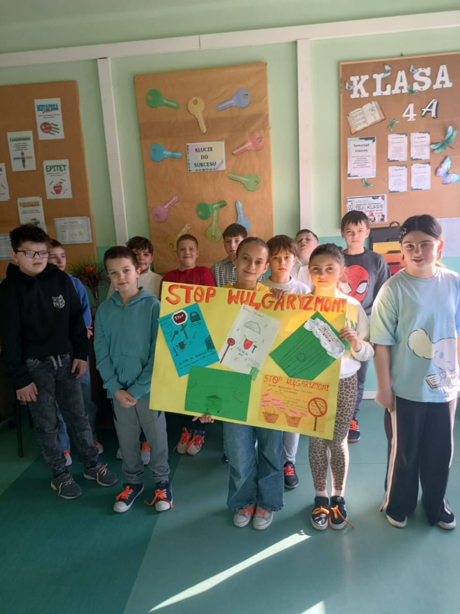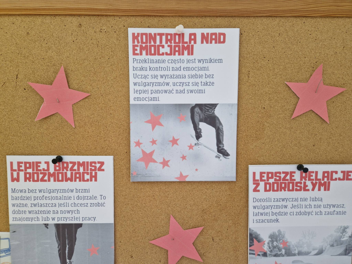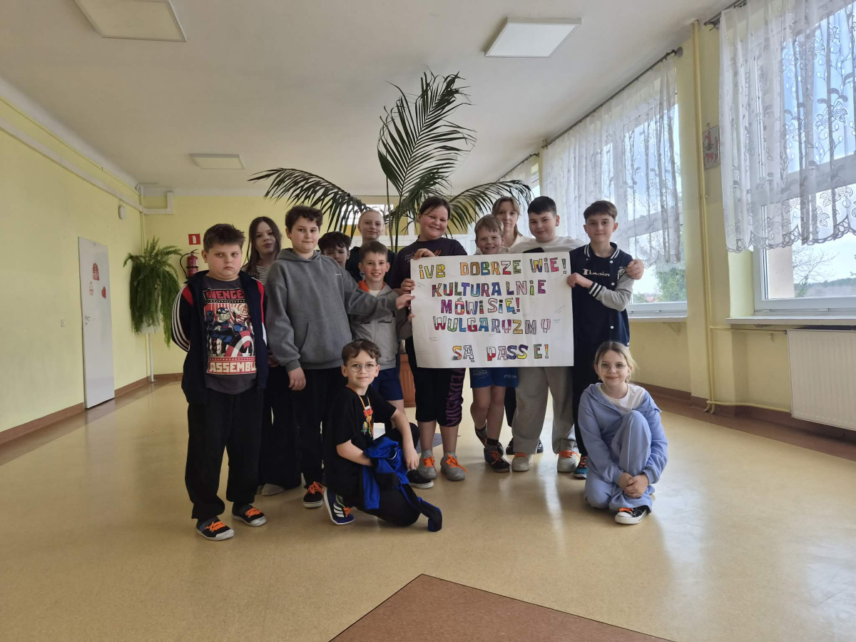 ✔ jak wyrażać emocje i złość bez obraźliwego języka.W klasach zorganizowano „Dzień bez wulgaryzmów”, a uczniowie przygotowali listy kreatywnych zamienników wulgarnych słów. Odbył się również konkurs na najlepszy plakat i hasło promujące kulturę języka.Samorząd Uczniowski przeprowadził akcję „Kulturalne słowo dnia”, w której każdego dnia na gazetce szkolnej pojawiał się zabawny i pozytywny zamiennik wulgaryzmu. Przygotowano także gazetkę tematyczną.Uczniowie uczestniczyli również w warsztatach dotyczących komunikacji bez agresji oraz radzenia sobie z emocjami.Dziękujemy wszystkim uczniom i nauczycielom za zaangażowanie w akcję. Wierzymy, że kulturalne słowo ma wielką moc i pomaga budować dobrą atmosferę w naszej szkolnej społeczności.