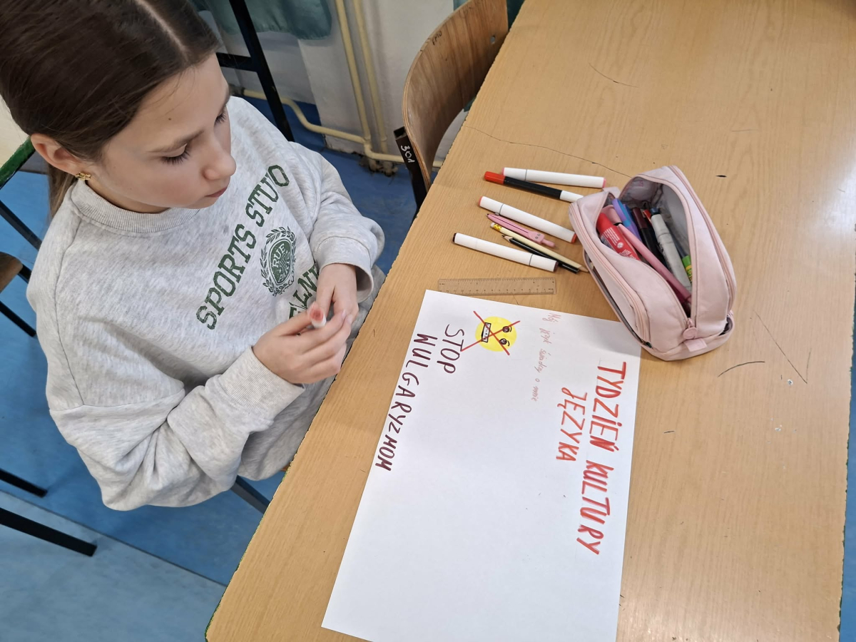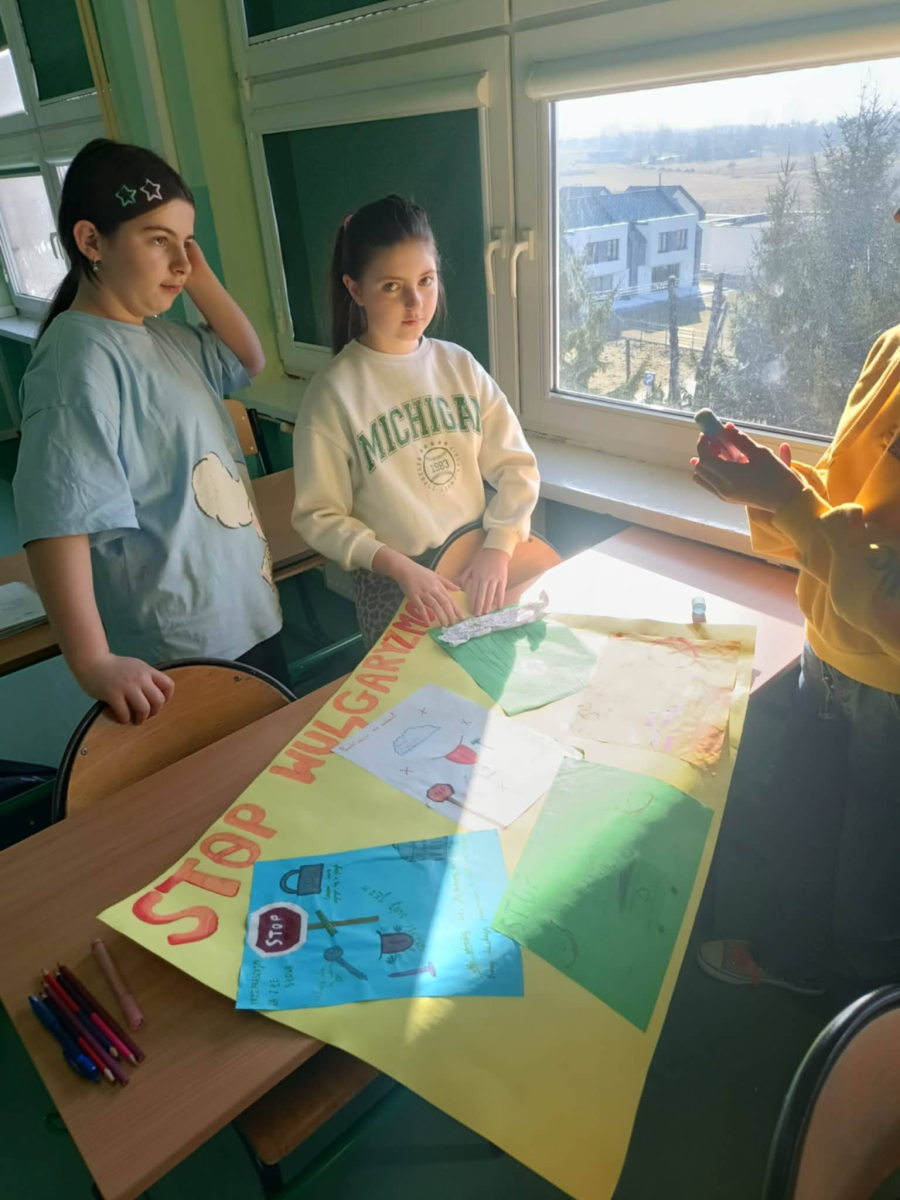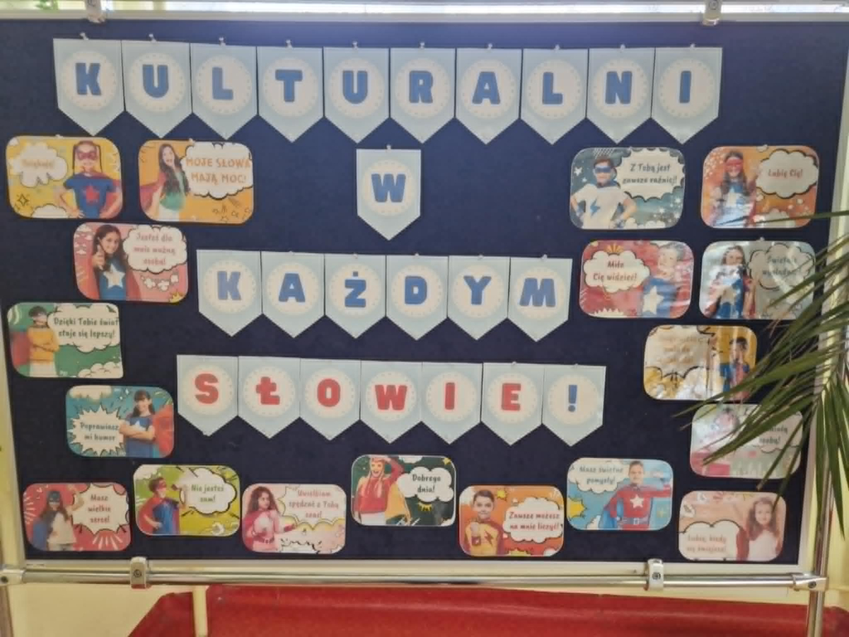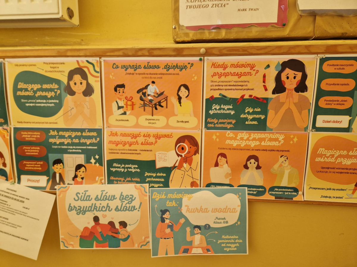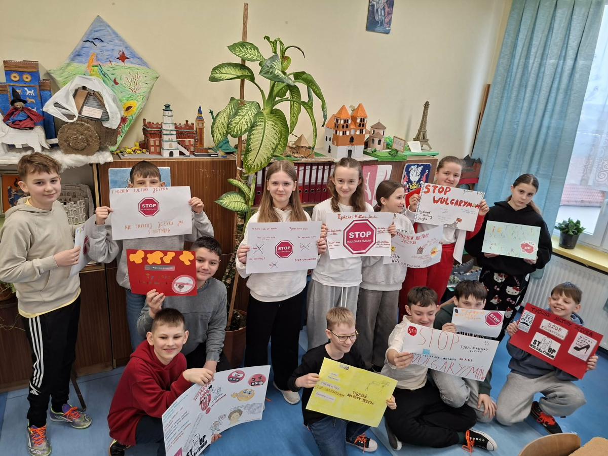 ✔ jak wyrażać emocje i złość bez obraźliwego języka.W klasach zorganizowano „Dzień bez wulgaryzmów”, a uczniowie przygotowali listy kreatywnych zamienników wulgarnych słów. Odbył się również konkurs na najlepszy plakat i hasło promujące kulturę języka.Samorząd Uczniowski przeprowadził akcję „Kulturalne słowo dnia”, w której każdego dnia na gazetce szkolnej pojawiał się zabawny i pozytywny zamiennik wulgaryzmu. Przygotowano także gazetkę tematyczną.Uczniowie uczestniczyli również w warsztatach dotyczących komunikacji bez agresji oraz radzenia sobie z emocjami.Dziękujemy wszystkim uczniom i nauczycielom za zaangażowanie w akcję. Wierzymy, że kulturalne słowo ma wielką moc i pomaga budować dobrą atmosferę w naszej szkolnej społeczności.