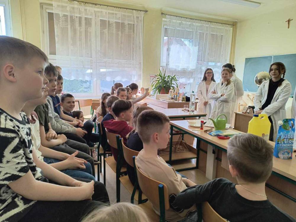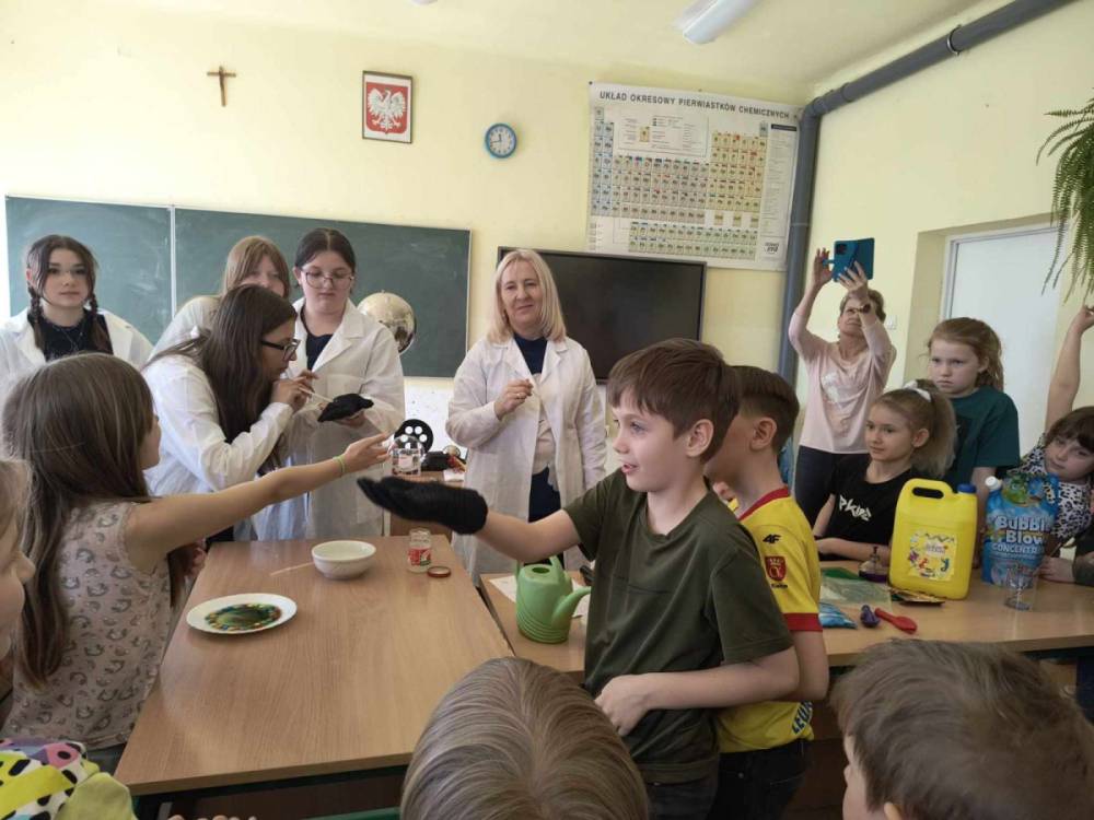 Wtorek był poświęcony chemii. Uczennice z klasy 8B: L. Górecka, Z. Olszak, D. Piec, M. Surma, M. Zimna wykonały szereg pokazowych eksperymentów chemicznych dla uczniów klasy 3 A. Wśród pokazów znalazł się kolorowy wulkan, kolorowe bąbelki, ciecz nienewtonowska, cukierkowa tęcza a także bardziej wymagające doświadczenia: otrzymywanie tlenu z nadtlenku wodoru oraz reakcje barwne kwasów i zasad. Młodsi uczniowie z zainteresowaniem oglądali pokazy, zadawali pytania i mogli sami nieco poeksperymentować.