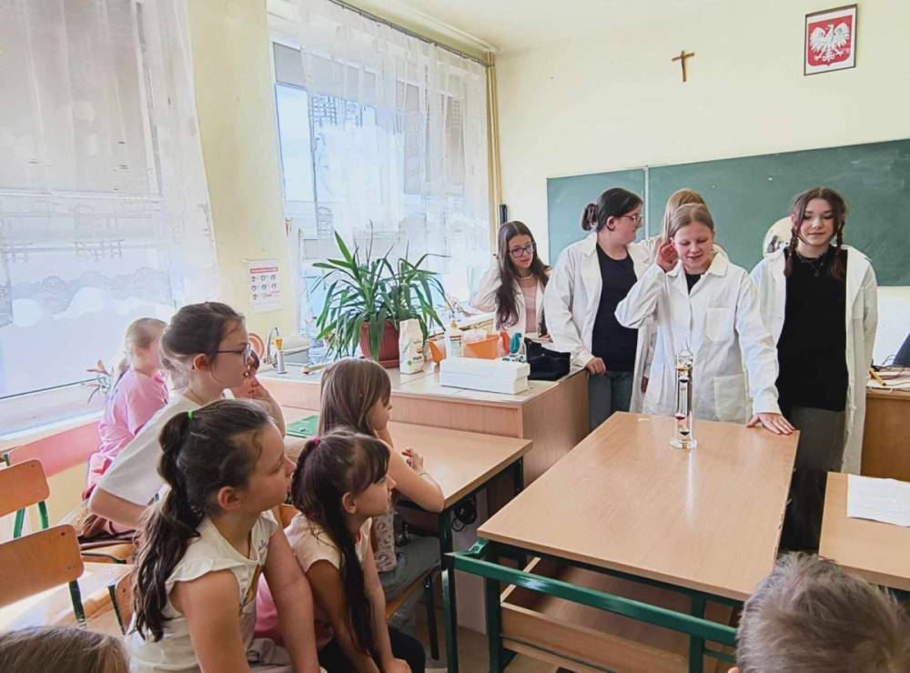 Środa była dniem fizyki. Większość uczniów uważa, że jest to trudny przedmiot, a przecież to właśnie dzięki niej możemy poznać zjawiska zachodzące w otaczającym nas świecie. Uczennice klasy 7b: Maja Baran, Julia Rowińska, Nela Sękowska, Judyta Kołomańska, Maja Świercz chciały podzielić się swoją pasją i pokazać, że fizyka to fascynujaca nauka, że można ją zrozumieć i polubić. Uczennice wykonały wiele ciekawych eksperymentów dla uczniów klas II, Ia i IIIb. Większość doświadczeń została wykonanych przy pomocy najprostszych środków, dlatego można powtórzyć je samodzielnie w domu. Te proste doświadczenia fizyczne zachęcają najmłodszych do stawiania hipotez, omawiania rezultatów tego, co widzieli i czego się nauczyli, i ponownego testowania swoich pomysłów. Pokazy wzbudziły wśród uczniów duże zainteresowanie, co zaowocowało ich czynnym udziałem w zaprezentowanych eksperymentach. Przekazana przez prowadzących wiedza, wsparta doświadczeniem, pozwoliła lepiej zrozumieć otaczający nas świat, a także zachęciła do dalszego odkrywania zastosowań fizyki w życiu codziennym.